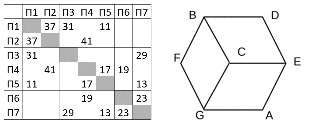 (А. Богданов) На рисунке справа схема дорог Н-ского района изображена в виде графа, в таблице содержатся сведения о длинах этих дорог (в километрах). Так как таблицу и схему рисовали независимо друг от друга, то нумерация населённых пунктов в таблице никак не связана с буквенными обозначениями на графе. В таблице в левом столбце указаны номера пунктов, откуда совершается движение, в первой строке – куда. Определите длину замкнутого пути, не проходящего через город С.