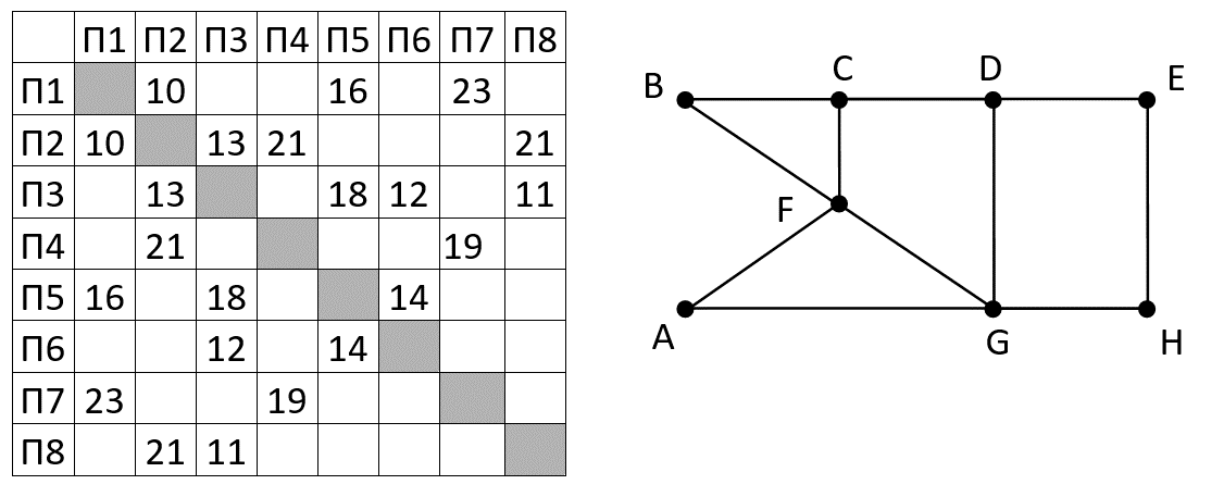 На рисунке справа схема дорог Н-ского района изображена в виде графа, в таблице содержатся сведения о длинах этих дорог (в километрах). Так как таблицу и схему рисовали независимо друг от друга, то нумерация населённых пунктов в таблице никак не связана с буквенными обозначениями на графе. В таблице в левом столбце указаны номера пунктов, откуда совершается движение, в первой строке – куда. Определите длину маршрута BCDGA.