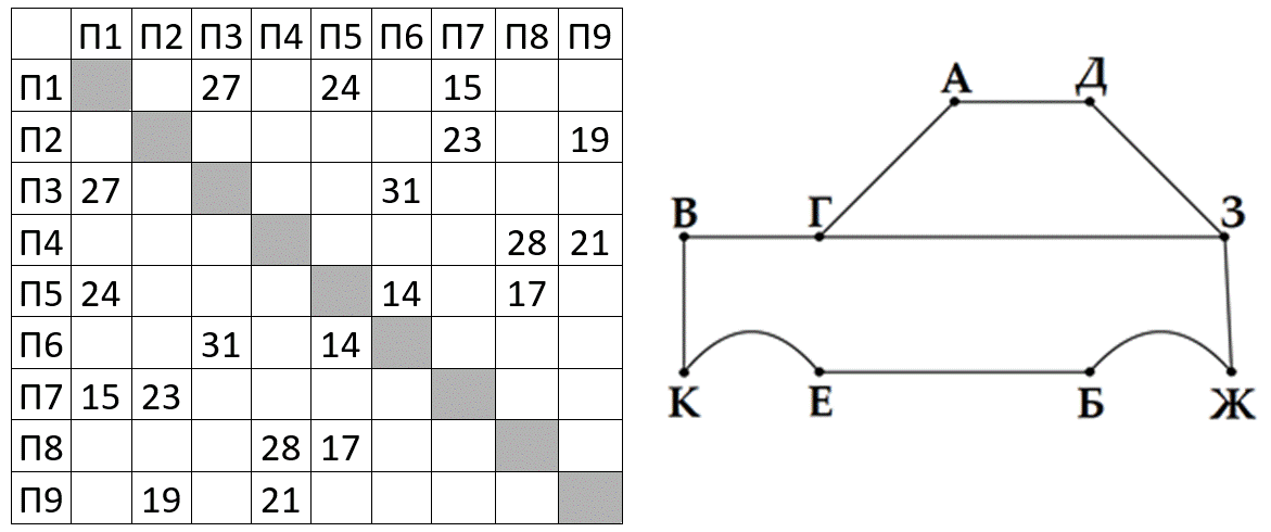 (И. Карпачёв) На рисунке справа схема дорог Н-ского района изображена в виде графа, в таблице содержатся сведения о длинах этих дорог (в километрах). Так как таблицу и схему рисовали независимо друг от друга, то нумерация населённых пунктов в таблице никак не связана с буквенными обозначениями на графе.