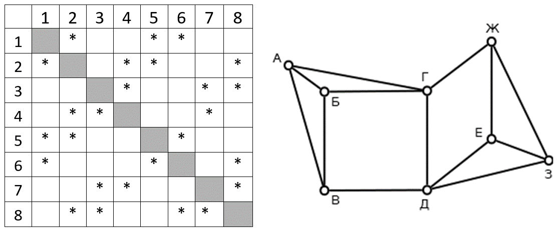 (Е. Джобс) На рисунке справа схема дорог Н-ского района изображена в виде графа, звёздочка в ячейке таблицы обозначает наличие дороги между двумя пунктами. Так как таблицу и схему рисовали независимо друг от друга, то нумерация населённых пунктов в таблице никак не связана с буквенными обозначениями на графе.