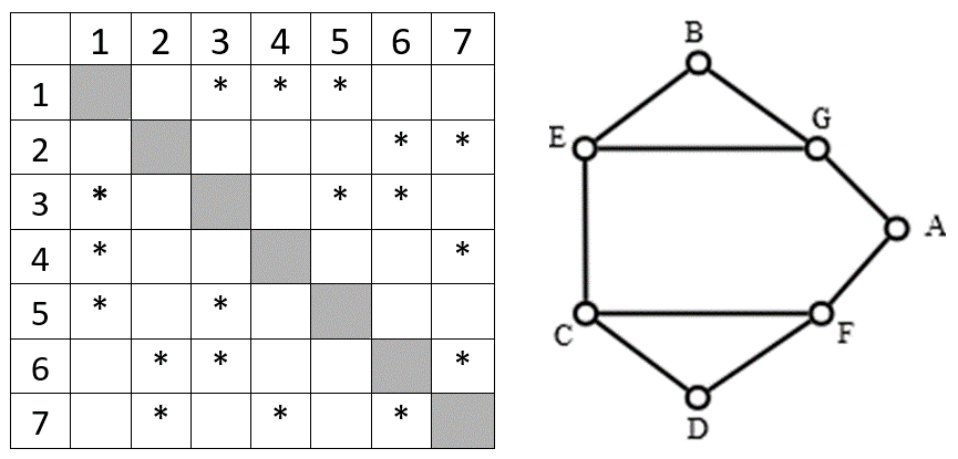 (ЕГЭ-2023) На рисунке справа схема дорог Н-ского района изображена в виде графа, звёздочка в ячейке таблицы обозначает наличие дороги между двумя пунктами. Так как таблицу и схему рисовали независимо друг от друга, то нумерация населённых пунктов в таблице никак не связана с буквенными обозначениями на графе.