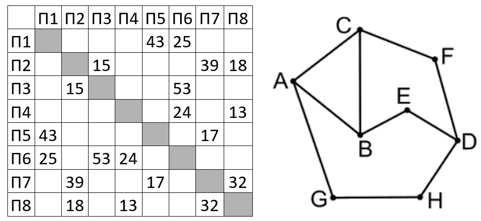 (ЕГЭ-2023) На рисунке справа схема дорог Н-ского района изображена в виде графа, в таблице содержатся сведения о длинах этих дорог (в километрах). Так как таблицу и схему рисовали независимо друг от друга, то нумерация населённых пунктов в таблице никак не связана с буквенными обозначениями на графе.