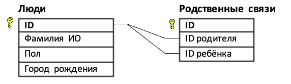 (Е. Джобс) В файле 3-4.xls приведён фрагмент базы данных «Родственники» о родственных отношениях между людьми. База данных состоит из двух таблиц. Таблица «Люди» содержит записи о людях - Фамилия ИО, пол («м» или «ж») и город рождения. Таблица «Родственные связи» содержит информацию о родительских связях - ID родителя из таблицы «Люди» и ID ребенка и той же таблицы. На рисунке приведена схема базы данных.