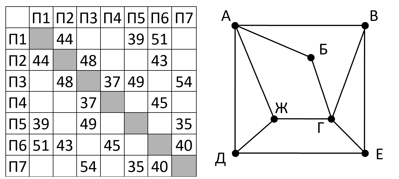(И. Карпачёв) На рисунке справа схема дорог Н-ского района изображена в виде графа, в таблице содержатся сведения о длинах этих дорог (в километрах). Так как таблицу и схему рисовали независимо друг от друга, то нумерация населённых пунктов в таблице никак не связана с буквенными обозначениями на графе.