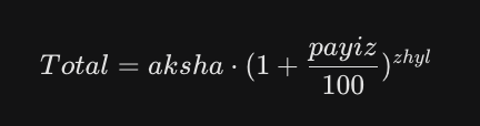 aksha — бастапқы ақша (мысалы, 100 000 теңге).