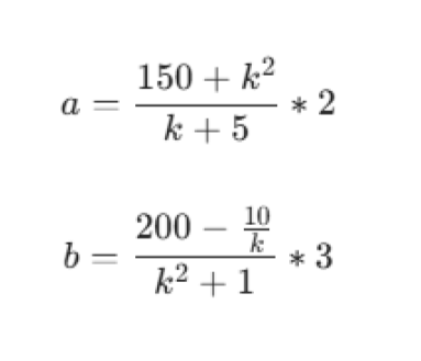На космической станции работают две автоматизированные системы. Продуктивность первой системы за один час равна a модулей. Продуктивность второй системы равна b модулей в час. Если система не успела доделать модуль за час, она продолжает работу в следующем часе. Также на скорость работы влияет коэффициент энергостабильности k.
