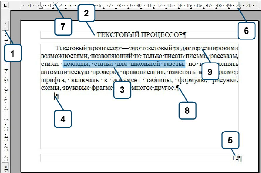 Сопоставление нумерации элементам интерфейса текстового процессора (на примере типового окна Microsoft Word / LibreOffice Writer)