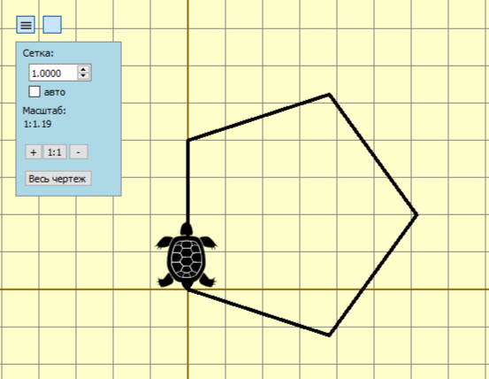 Нарисуй правильный пятиугольник со стороной 4 клетки, используя цикл.