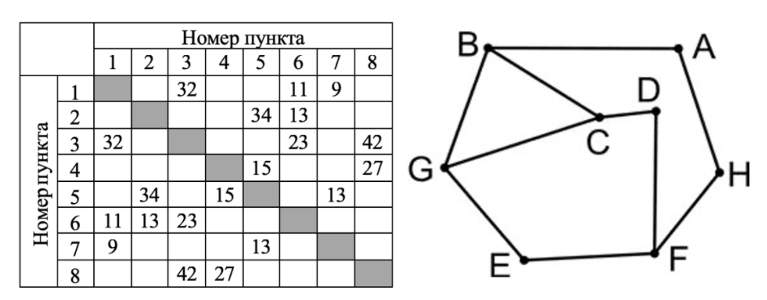 Так как таблицу и схему рисовали независимо друг от друга, то нумерация населённых пунктов в таблице никак не связана с буквенными обозначениями на графе. Определите, какова сумма протяжённостей дорог из пункта G в пункт E и из пункта C в пункт D. В ответе запишите целое число.