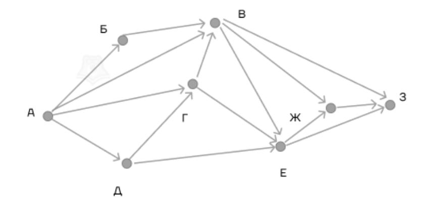 На рисунке представлена схема путей, связывающих пункты А, Б, В, Г, Д, Е, Ж, З. По каждому пути можно двигаться в направлении, которое указывает стрелка. Найдите количество различных путей из города А в город З, проходящих через город В или Е?