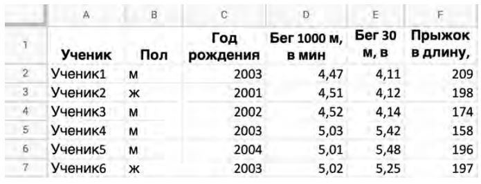 Столбец А содержит имя ученика. Столбец B содержит пол учащегося. Столбец C содержит год рождения. Столбец D содержит результат бега на 1000 м. Столбец E содержит результат бега на 30 м. Столбец F содержит результат прыжка в длину. В таблице содержится информация о 50 учениках.