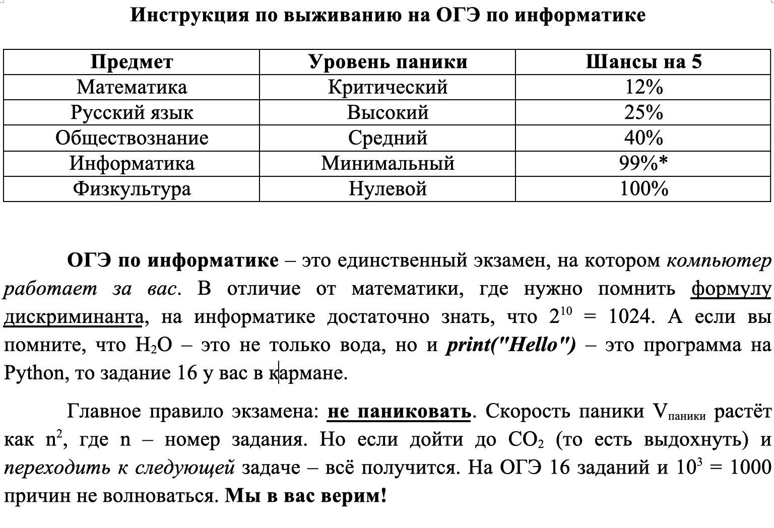 Создайте в текстовом редакторе документ и напишите в нём следующий текст, точно воспроизведя всё оформление текста, имеющееся в образце. Данный текст должен быть набран шрифтом размером 14 пунктов обычного начертания. Отступ первой строки каждого абзаца основного текста — 1 см. Расстояние между строками текста не менее высоты одинарного, но не более полуторного междустрочного интервала. Основной текст выровнен по ширине; заголовок текста — по центру. Текст в ячейках заголовка таблицы и третьего столбца таблицы — по центру. Текст в ячейках таблицы выровнен по ценрту. В основном тексте и таблице есть слова, выделенные полужирным шрифтом и курсивом или подчёркиванием. Ширина таблицы равна ширине основного текста. Таблица выровнена на странице по центру горизонтали.