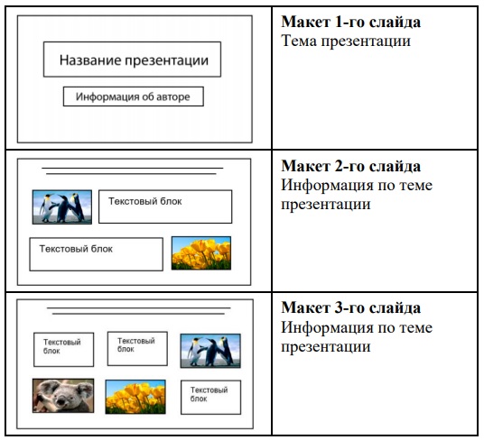 второй слайд – основная информация в соответствии с заданием, размещённая по образцу на рисунке макета слайда 2:
