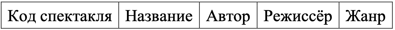 Таблица «Спектакли» содержит информацию о репертуаре театра. Заголовок таблицы имеет следующий вид.
