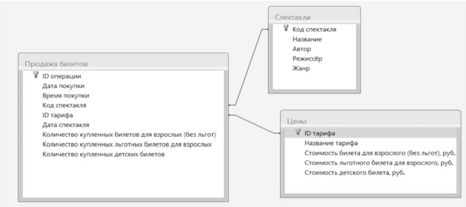 В файле приведён фрагмент базы данных «Театр», принадлежащей одному из театров города. База данных состоит из трёх связанных прямоугольных таблиц.
