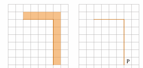 На бесконечном поле имеется вертикальная стена. Длина стены — 6 клеток. От верхнего конца стены влево отходит горизонтальная стена длиной 4 клетки. Робот находится в клетке, расположенной справа от нижнего края вертикальной стены. На рисунке указано расположение стен и Робота. Робот обозначен буквой «Р».