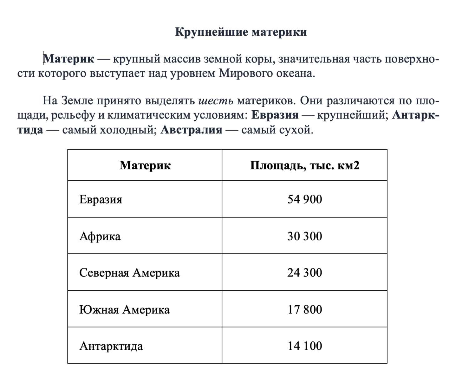 Данный текст содержит два абзаца, заголовок и таблицу, должен быть набран шрифтом размером 14 пунктов обычного начертания. Отступ первой строки абзацев основного текста — 1 см. Расстояние между строками текста не менее одинарного, но не более полуторного междустрочного интервала. Основной текст выровнен по ширине; заголовки в тексте и таблице — по центру; в ячейках первого столбца применено выравнивание по левому краю; в ячейках второго столбца — по центру. В основном тексте и таблице есть слова, выделенные полужирным шрифтом, курсивом или подчёркиванием. Таблица выровнена на странице по центру по горизонтали. Ширина таблицы меньше ширины основного текста.